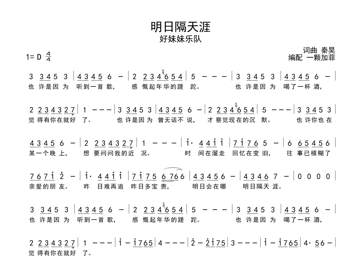 《明日隔天涯》是好妹妹乐队演唱的一首歌曲,拍号为4/4拍,这份简谱共有一张高清图谱,图谱由 @一颗加菲 编配上传。