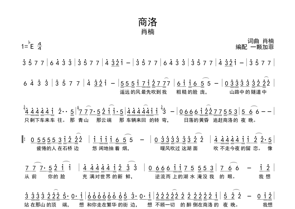 《商洛》是肖楠演唱的一首歌曲,拍号为4/4拍,这份简谱共有一张高清图谱,图谱由 @一颗加菲 编配上传。