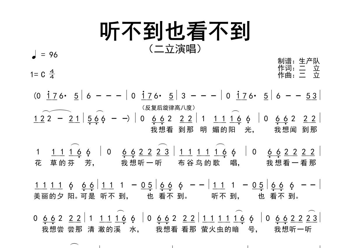 《听不到也看不到》是二立演唱的一首歌曲,原版简谱,拍号为4/4拍,歌曲速度为每分钟96拍,这份简谱共有一张高清图谱,图谱由 @生产队 编配上传二立演唱的歌曲《听不到也看不到》原版简谱。
