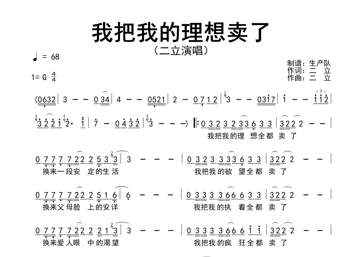 《我把我的理想卖了》是二立演唱的一首歌曲,原版简谱,拍号为4/4拍,歌曲速度为每分钟68拍,这份简谱共有一张高清图谱,图谱由 @生产队 编配上传二立演唱的歌曲《我把我的理想卖了》原版简谱。