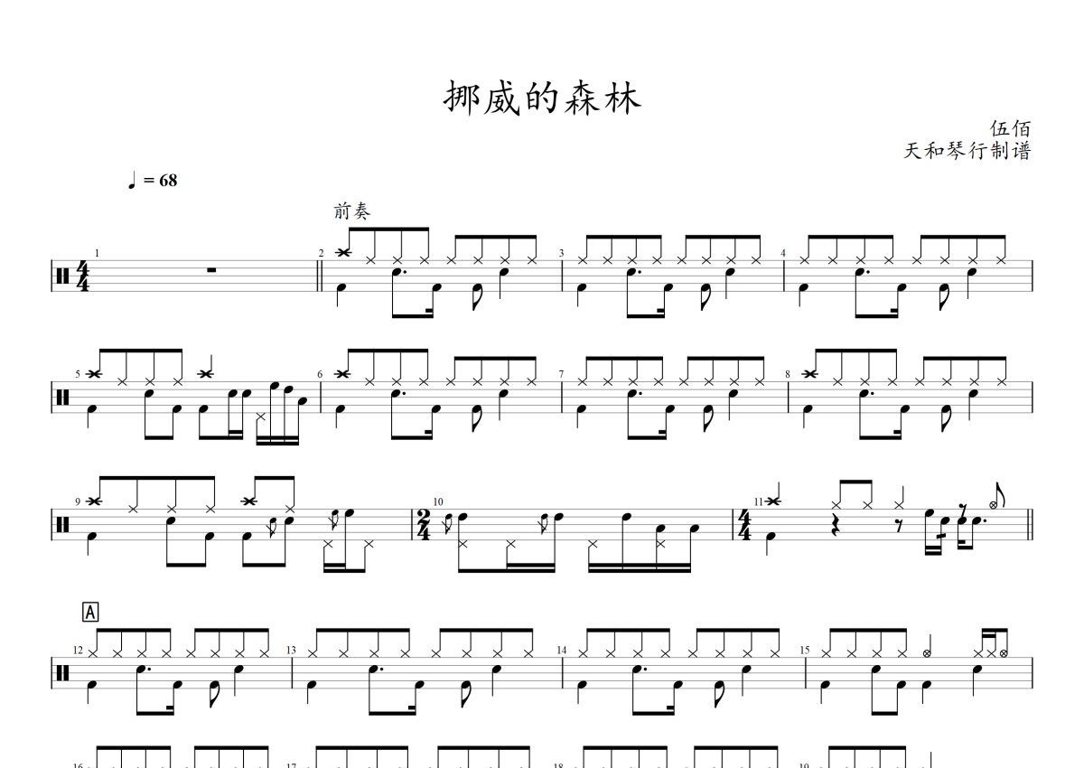 《挪威的森林》是伍佰演唱的一首歌曲,拍号为4/4拍,歌曲速度为每分钟68拍,这份架子鼓谱共有三张高清图谱,图谱由 @音符喷血者 编配上传,图谱使用五线谱编配,使用这份挪威的森林架子鼓谱,你将能够轻松地敲打出这首伍佰的挪威的森林,快来尝试吧。