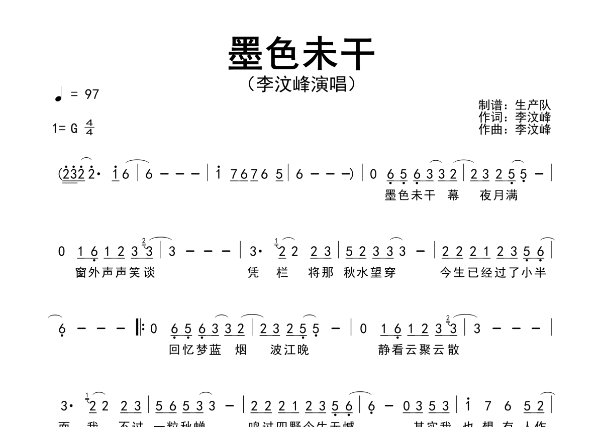 《墨色未干》是李汶峰演唱的一首歌曲,原版简谱,拍号为4/4拍,歌曲速度为每分钟97拍,这份简谱共有一张高清图谱,图谱由 @生产队 编配上传李汶峰演唱的歌曲《墨色未干》原版简谱。