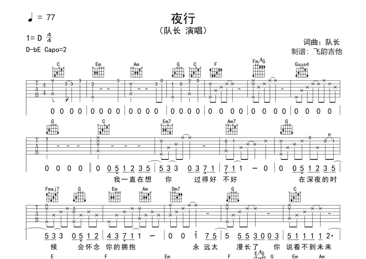 队长《夜行》吉他谱 - C调弹唱六线谱