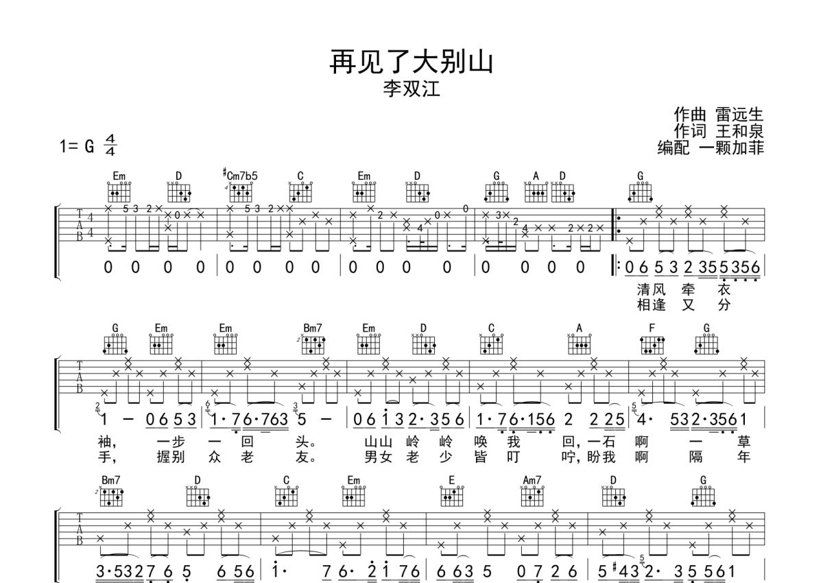 李双江《再见了大别山》吉他谱 - G调弹唱六线谱