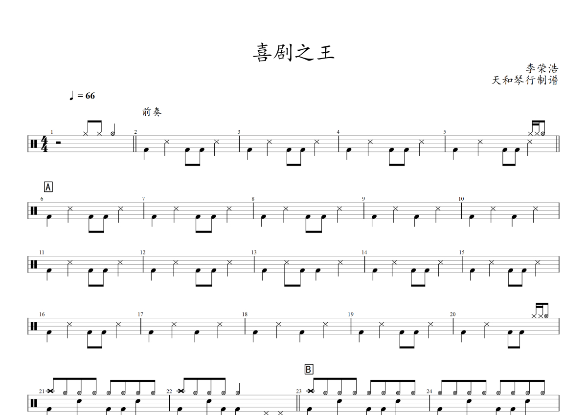 《喜剧之王》是李荣浩演唱的一首歌曲,拍号为4/4拍,歌曲速度为每分钟66拍,这份架子鼓谱共有两张高清图谱,图谱由 @音符喷血者 编配上传,图谱使用五线谱编配,使用这份喜剧之王架子鼓谱,你将能够轻松地敲打出这首李荣浩的喜剧之王,快来尝试吧。