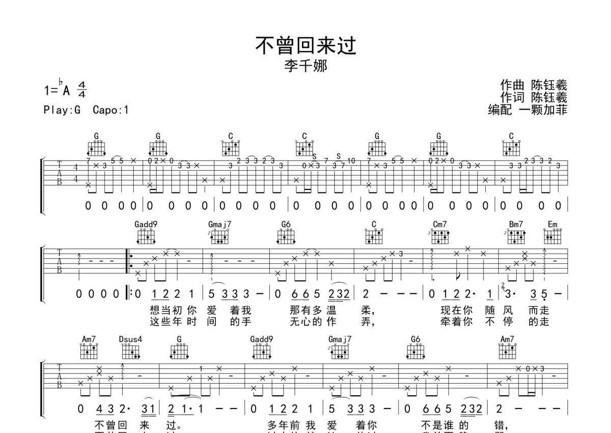 《不曾回来过》是李千娜演唱的一首歌曲,拍号为4/4拍,歌曲原调为Ab调,但由于原调指法比较难,为了方便弹奏,本吉他谱采用的是G调指法编配,变调夹3品弹奏即为原调,当然也可以根据自己的音域改变变调夹位置,或者通过改变和弦调性,以方便自己弹奏,这份吉他谱共有两张高清图谱,图谱由 @一颗加菲 编配上传,图谱使用六线谱编配,包含吉他和弦指法、简谱以及歌词部分,曲谱配备了相关的音频提供试听,使用这份不曾回来过吉他谱,可以让你更加方便地掌握这首歌曲的弹唱技巧,快来尝试吧。