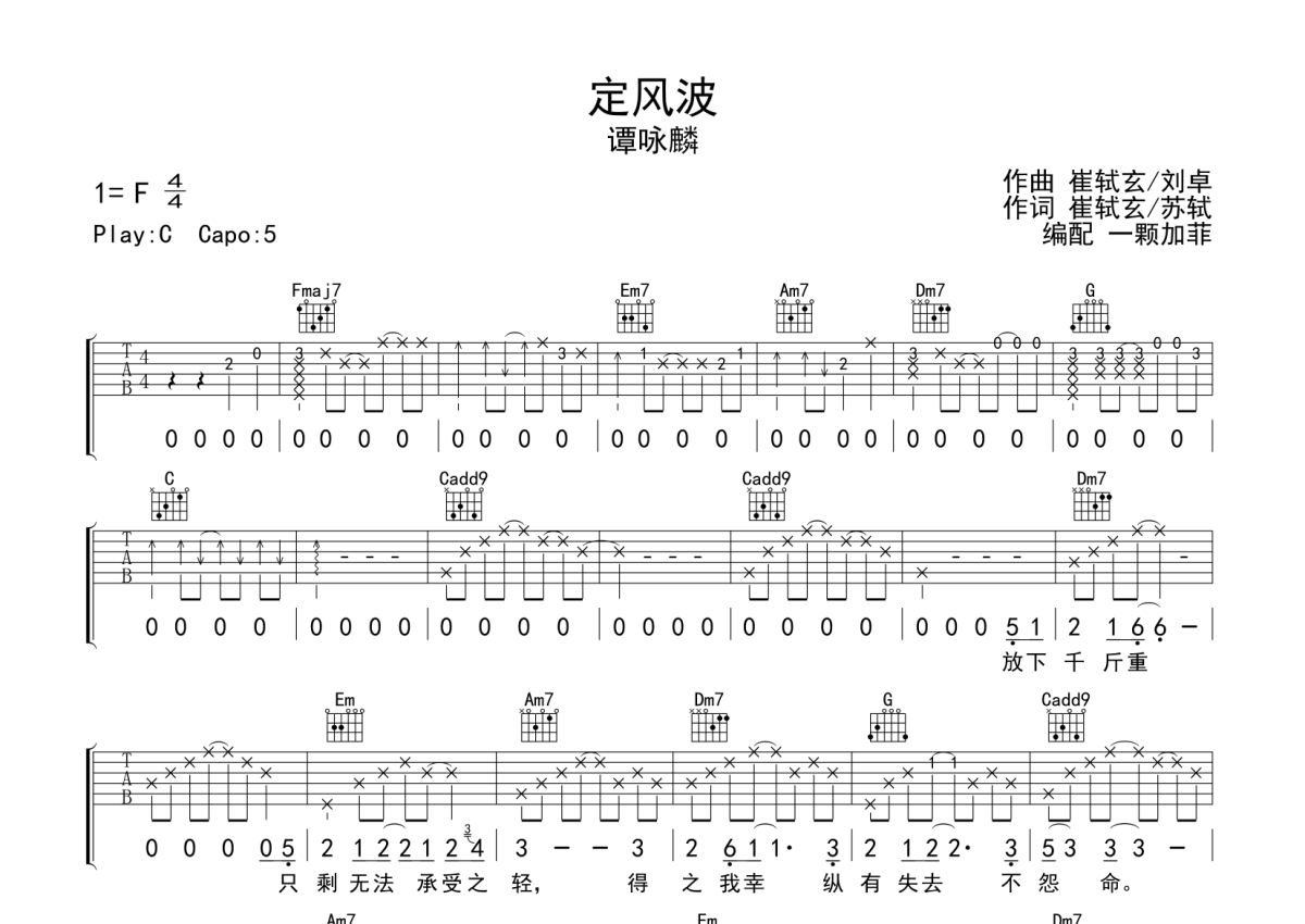 《定风波》是谭咏麟演唱的一首歌曲,拍号为4/4拍,歌曲原调为F调,但由于原调指法比较难,为了方便弹奏,本吉他谱采用的是C调指法编配,变调夹5品弹奏即为原调,当然也可以根据自己的音域改变变调夹位置,或者通过改变和弦调性,以方便自己弹奏,这份吉他谱共有两张高清图谱,图谱由 @一颗加菲 编配上传,图谱使用六线谱编配,包含吉他和弦指法、简谱以及歌词部分,曲谱配备了相关的音频提供试听,使用这份定风波吉他谱,可以让你更加方便地掌握这首歌曲的弹唱技巧,快来尝试吧。