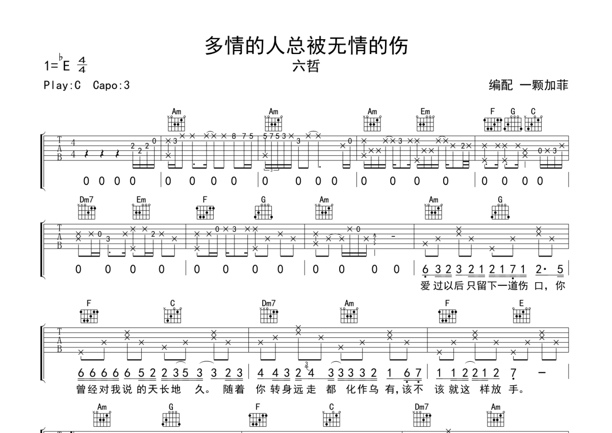 《多情的人总被无情的伤》是六哲演唱的一首歌曲,拍号为4/4拍,歌曲原调为Eb调,但由于原调指法比较难,为了方便弹奏,本吉他谱采用的是C调指法编配,变调夹3品弹奏即为原调,当然也可以根据自己的音域改变变调夹位置,或者通过改变和弦调性,以方便自己弹奏,这份吉他谱共有两张高清图谱,图谱由 @一颗加菲 编配上传,图谱使用六线谱编配,包含吉他和弦指法、简谱以及歌词部分,曲谱配备了相关的音频提供试听,使用这份多情的人总被无情的伤吉他谱,可以让你更加方便地掌握这首歌曲的弹唱技巧,快来尝试吧。