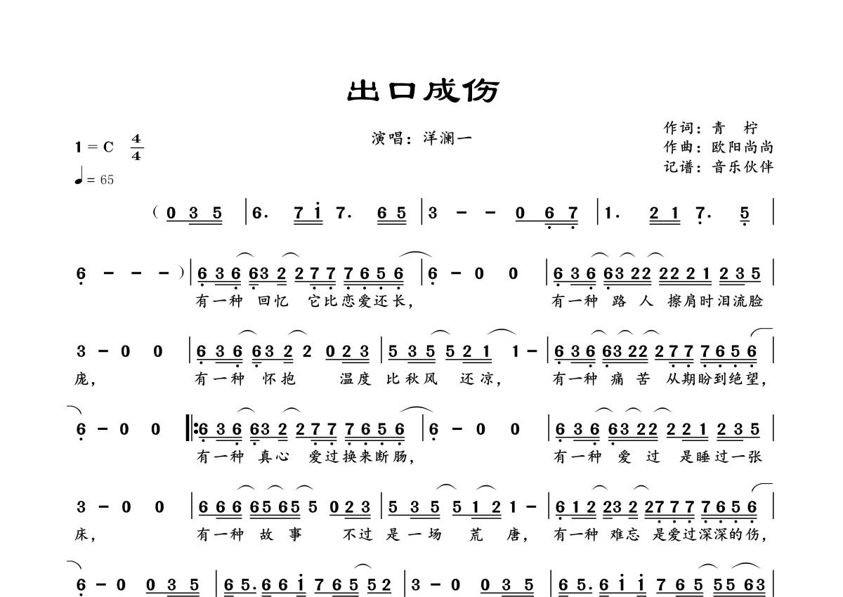 《出口成伤》是洋澜一演唱的一首歌曲,拍号为4/4拍,歌曲速度为每分钟65拍,这份简谱共有一张高清图谱,图谱由 @音乐伙伴 编配上传。