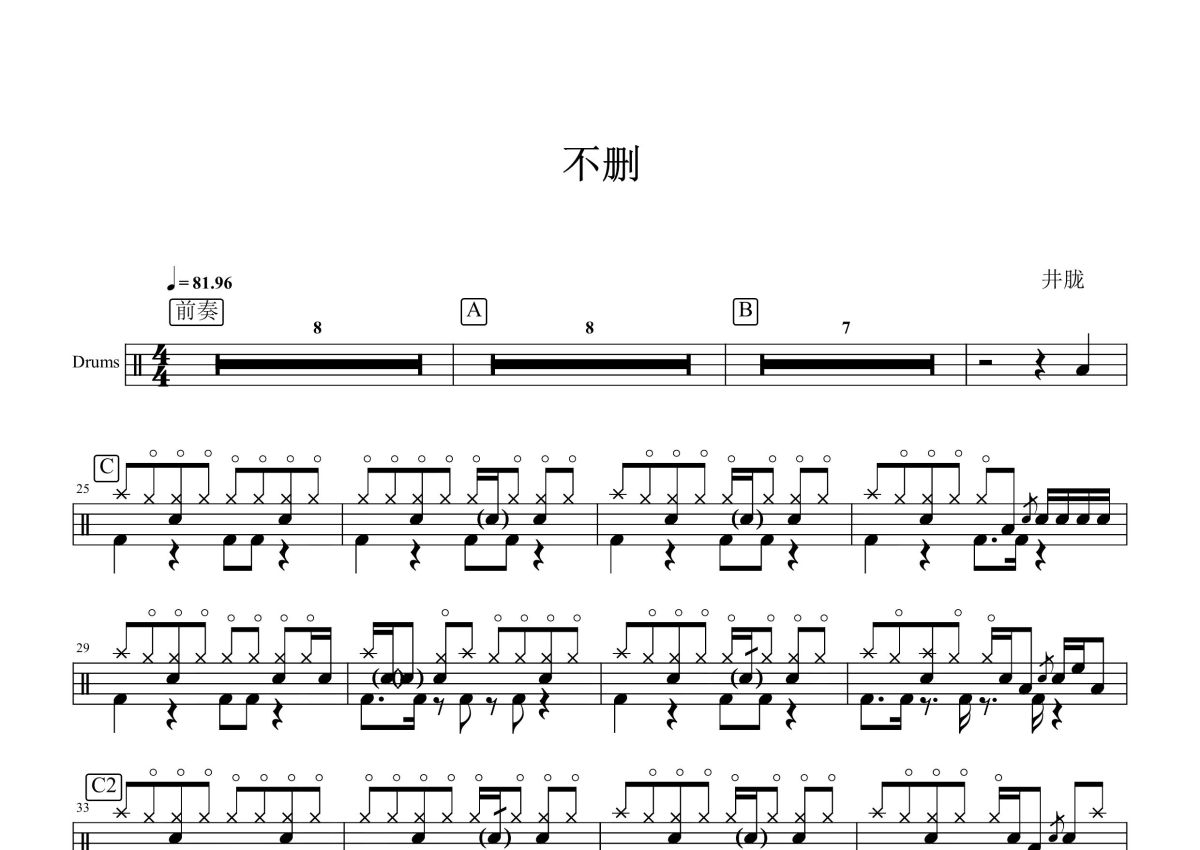 《不删》是井胧演唱的一首歌曲,这份鼓谱共有两张高清图谱,图谱由 @打鼓谱 编配上传,图谱使用五线谱编配,使用这份不删架子鼓谱,你将能够轻松地敲打出这首井胧的不删,快来尝试吧。《不删》是由闫骁男和张娉言和@骁Studio作词,闫骁男和@骁Studio作曲,姚瀚霄@骁Studio编曲,井胧演唱的歌曲,发行于2020年10月8日。收录于同名专辑《不删》中。井胧,1997年7月7日出生于辽宁省沈阳市,中国内地流行乐男歌手、短视频创作者,毕业于沈阳音乐学院。