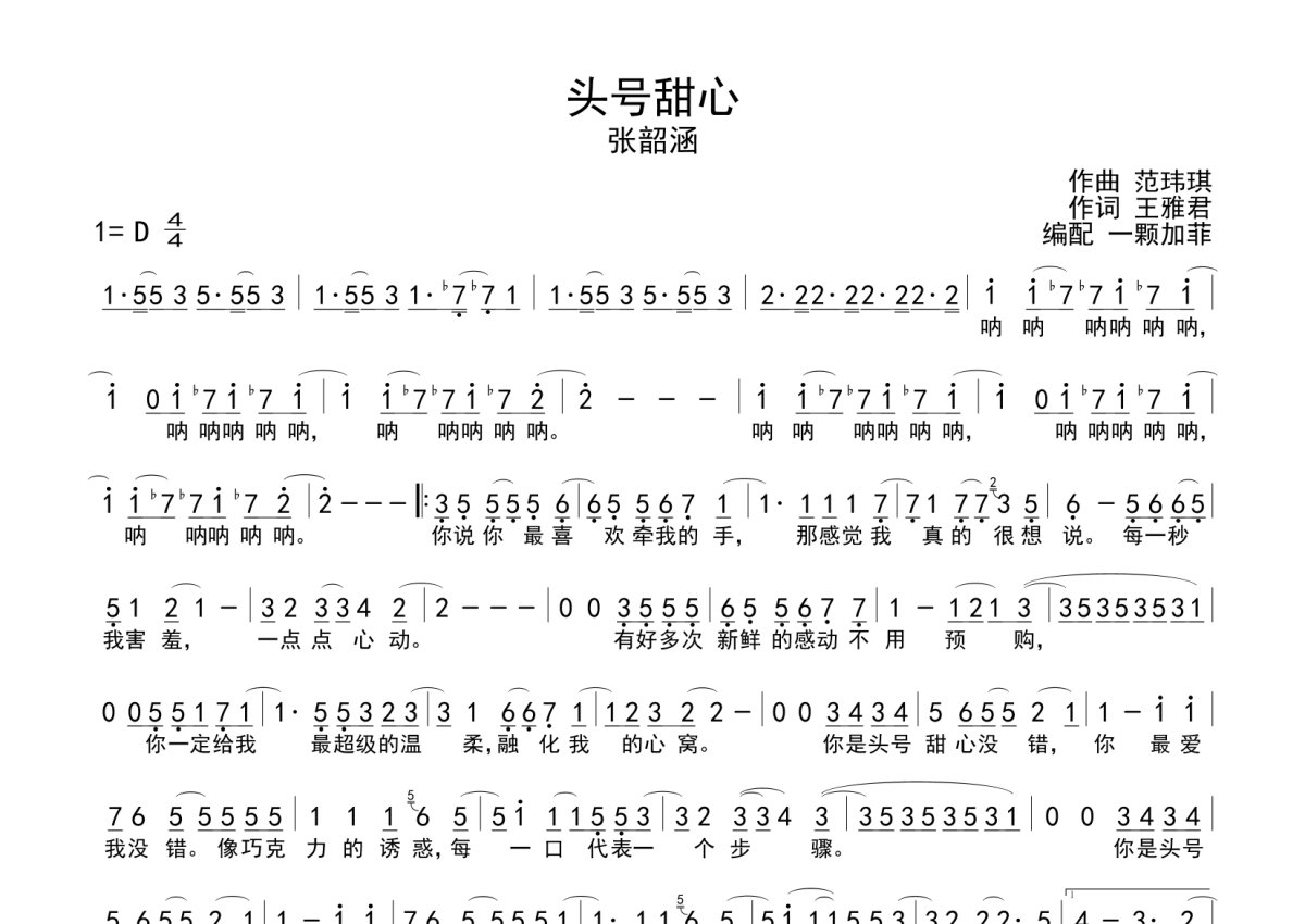 《头号甜心》是张韶涵演唱的一首歌曲,拍号为4/4拍,这份简谱共有一张高清图谱,图谱由 @一颗加菲 编配上传。