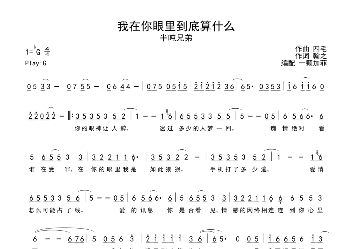 《我在你眼里到底算什么》是半吨兄弟演唱的一首歌曲,拍号为4/4拍,这份简谱共有一张高清图谱,图谱由 @一颗加菲 编配上传。
