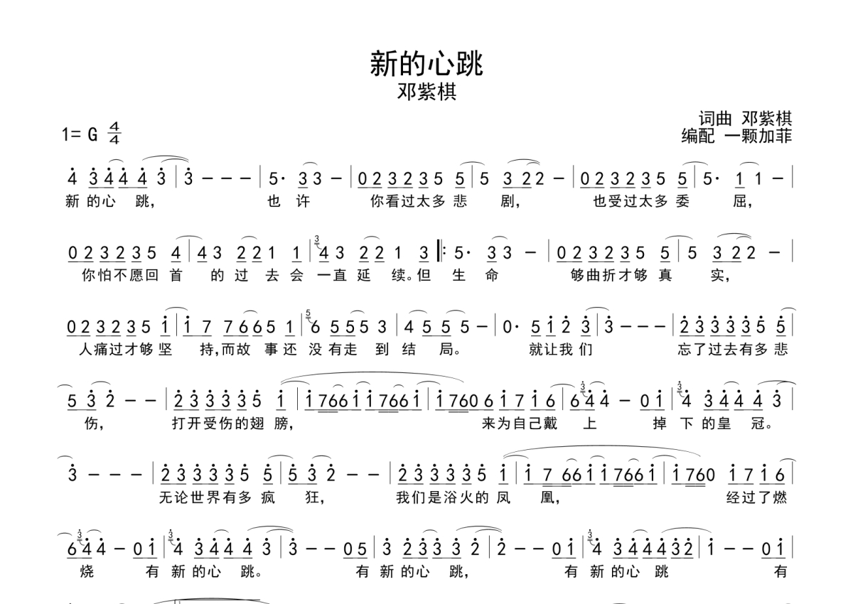 《新的心跳》是邓紫棋演唱的一首歌曲,拍号为4/4拍,这份简谱共有一张高清图谱,图谱由 @一颗加菲 编配上传。