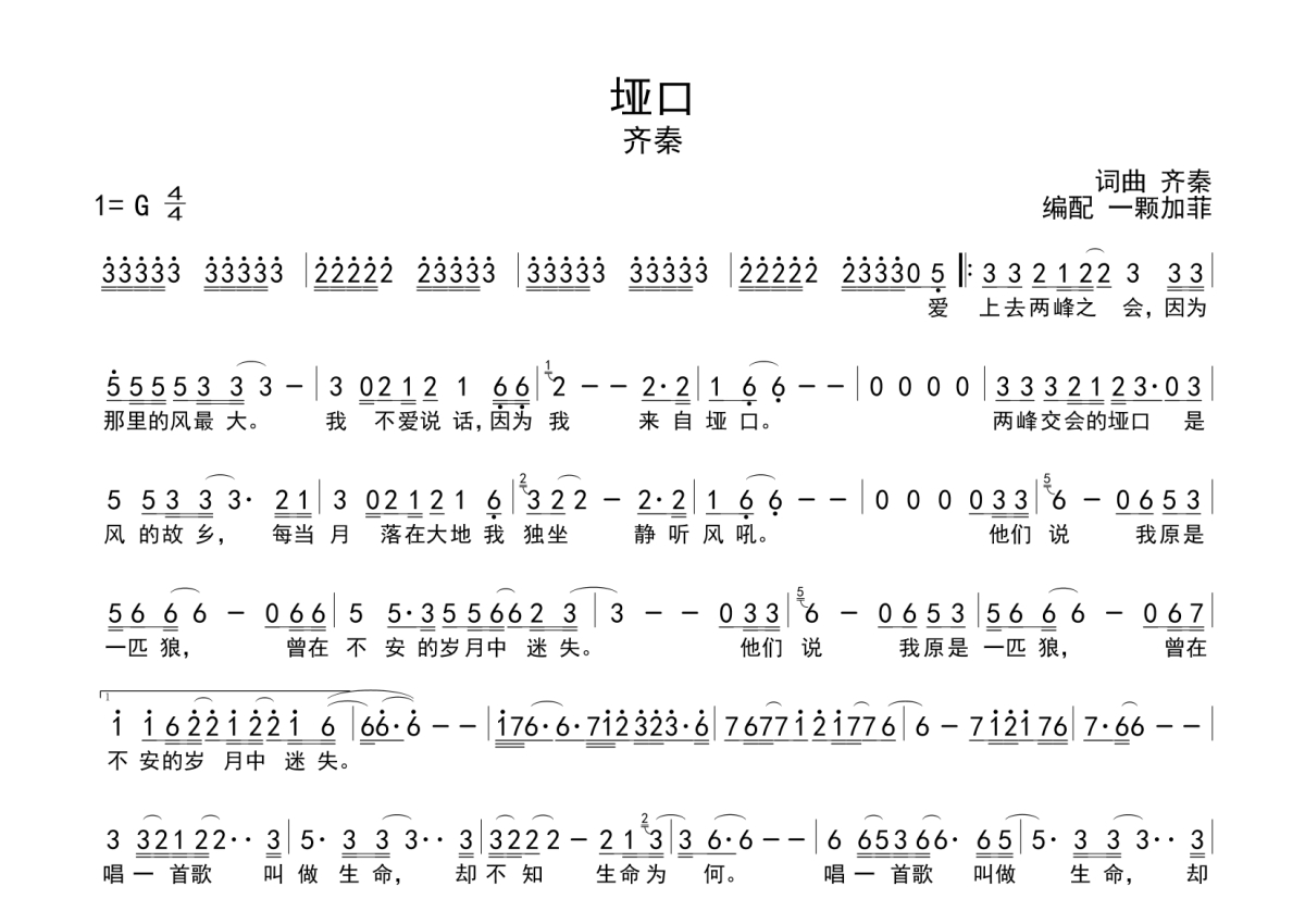 《垭口》是齐秦演唱的一首歌曲,拍号为4/4拍,这份简谱共有一张高清图谱,图谱由 @一颗加菲 编配上传。