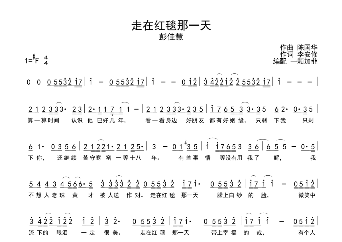 《走在红毯那一天》是彭佳慧演唱的一首歌曲,这份简谱共有一张高清图谱,图谱由 @一颗加菲 编配上传。