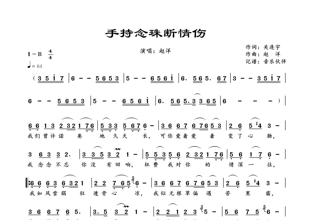 《手持念珠断情伤》是赵洋演唱的一首歌曲,拍号为4/4拍,歌曲速度为每分钟64拍,这份简谱共有一张高清图谱,图谱由 @音乐伙伴 编配上传。