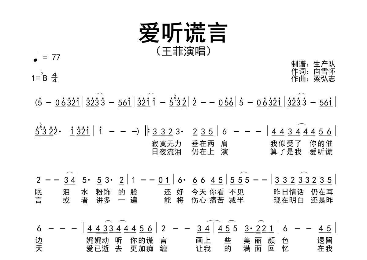 《爱听谎言》是王菲演唱的一首歌曲,原版简谱,拍号为4/4拍,歌曲速度为每分钟77拍,这份简谱共有一张高清图谱,图谱由 @生产队 编配上传王菲演唱的经典歌曲《爱听谎言》原版简谱,完整的前奏,间奏solo编配。
