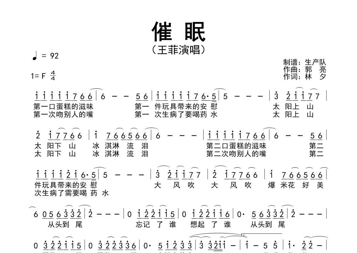 《催眠》是王菲演唱的一首歌曲,原版简谱,拍号为4/4拍,歌曲速度为每分钟92拍,这份简谱共有一张高清图谱,图谱由 @生产队 编配上传王菲演唱的经典歌曲《催眠》原版简谱。