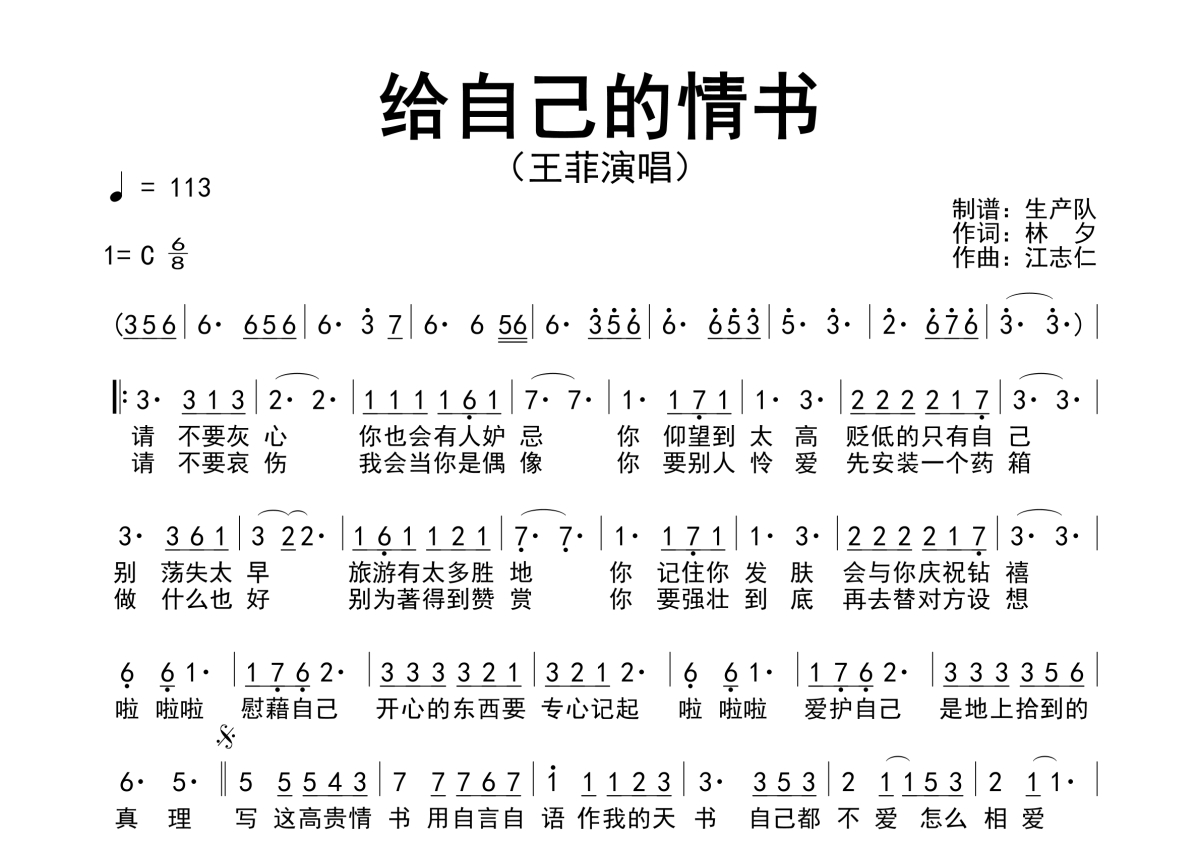 《给自己的情书》是王菲演唱的一首歌曲,原版简谱,拍号为6/8拍,歌曲速度为每分钟113拍,这份简谱共有一张高清图谱,图谱由 @生产队 编配上传王菲演唱的经典歌曲《给自己的情书》原版简谱。