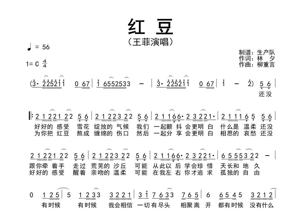 《红豆》是王菲演唱的一首歌曲,原版简谱,拍号为4/4拍,歌曲速度为每分钟56拍,这份简谱共有一张高清图谱,图谱由 @生产队 编配上传王菲演唱的经典歌曲《红豆》原版简谱,完整的前奏,间奏,尾奏solo编配。