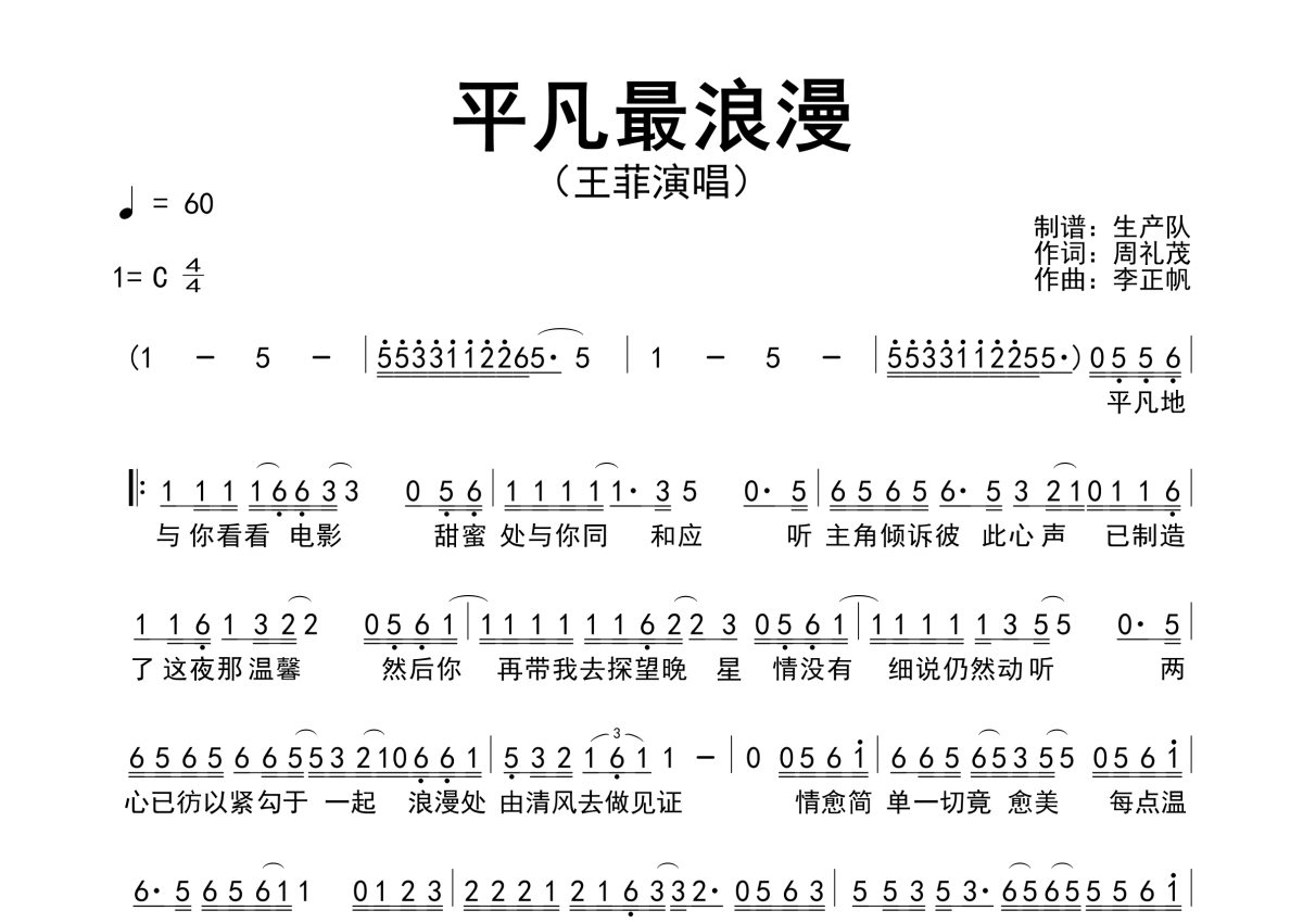 《平凡最浪漫》是王菲演唱的一首歌曲,原版简谱,拍号为4/4拍,歌曲速度为每分钟60拍,这份简谱共有一张高清图谱,图谱由 @生产队 编配上传王菲演唱的经典歌曲《平凡最浪漫》原版简谱。