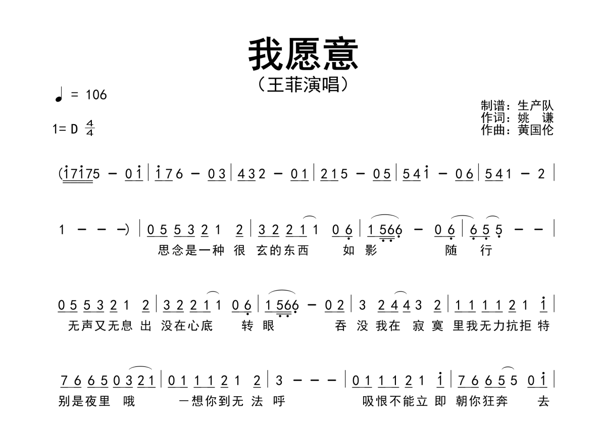 《我愿意》是王菲演唱的一首歌曲,原版简谱,拍号为4/4拍,歌曲速度为每分钟106拍,这份简谱共有一张高清图谱,图谱由 @生产队 编配上传王菲演唱的经典歌曲《我愿意》原版简谱。