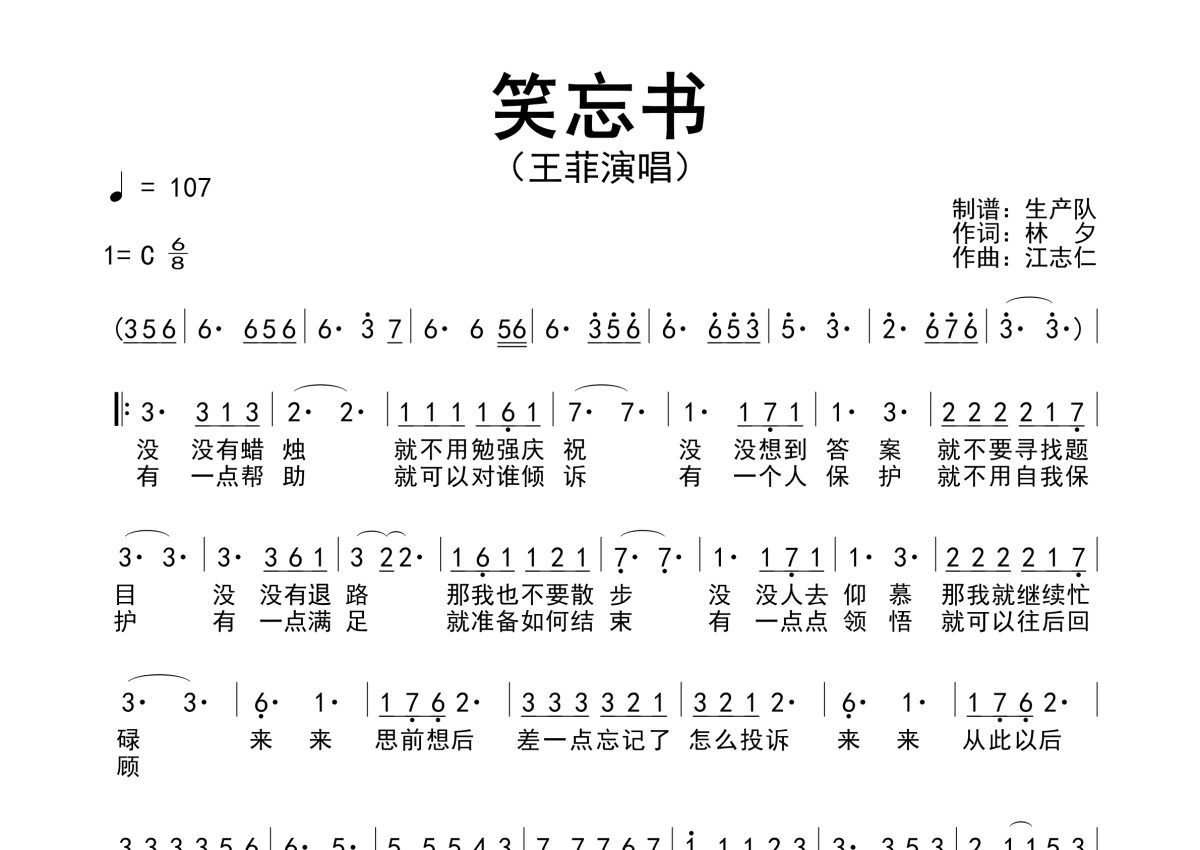《笑忘书》是王菲演唱的一首歌曲,原版简谱,拍号为6/8拍,歌曲速度为每分钟107拍,这份简谱共有一张高清图谱,图谱由 @生产队 编配上传王菲演唱的经典歌曲《笑忘书》原版简谱。