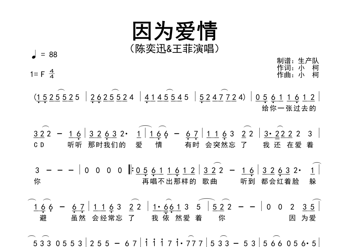 《因为爱情》是陈奕迅/王菲演唱的一首歌曲,原版简谱,拍号为4/4拍,歌曲速度为每分钟88拍,这份简谱共有一张高清图谱,图谱由 @生产队 编配上传陈奕迅&王菲演唱的经典歌曲《因为爱情》原版简谱,完整的前奏,间奏solo编配。