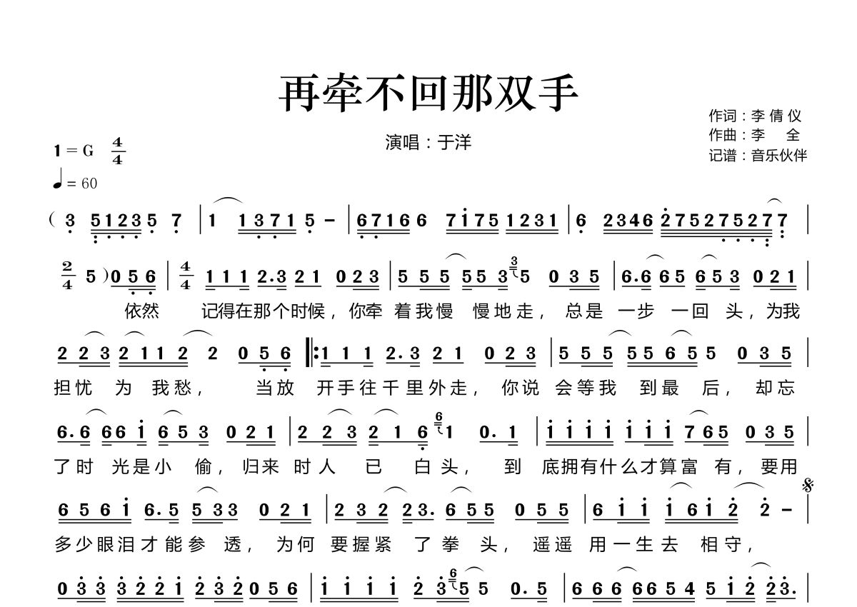 《再牵不回那双手》是于洋演唱的一首歌曲,这份简谱共有一张高清图谱,图谱由 @音乐伙伴 编配上传。