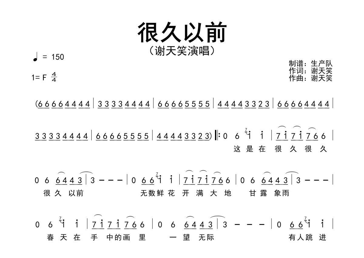 《很久以前》是谢天笑演唱的一首歌曲,原版简谱,拍号为4/4拍,歌曲速度为每分钟150拍,这份简谱共有两张高清图谱,图谱由 @生产队 编配上传谢天笑演唱的歌曲《很久以前》原版简谱。