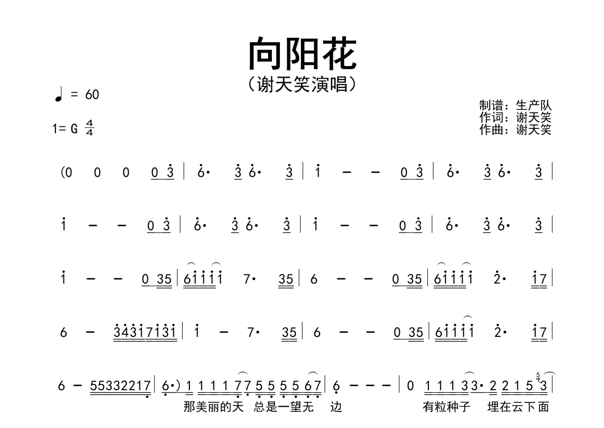 《向阳花》是谢天笑演唱的一首歌曲,原版简谱,拍号为4/4拍,歌曲速度为每分钟60拍,这份简谱共有两张高清图谱,图谱由 @生产队 编配上传谢天笑演唱的歌曲《向阳花》原版简谱。