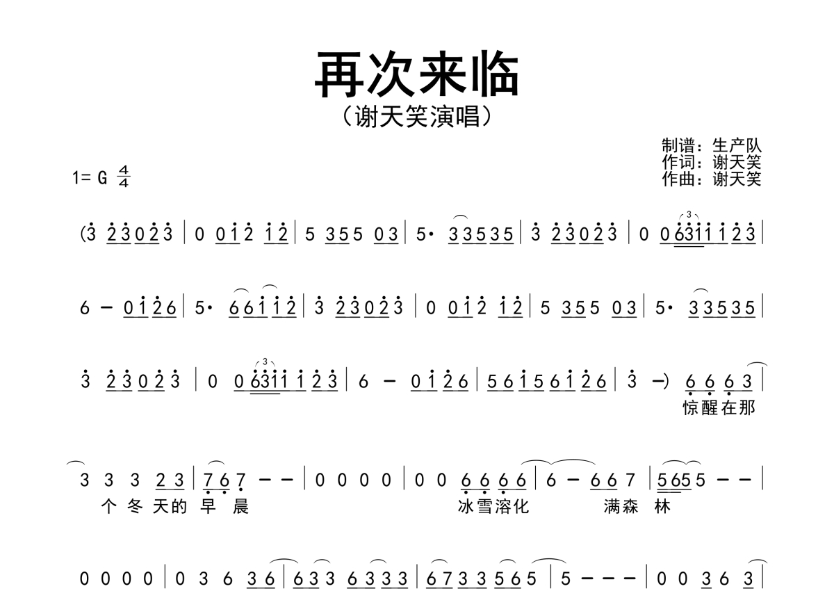 《再次来临》是谢天笑演唱的一首歌曲,原版简谱,拍号为4/4拍,歌曲速度为每分钟124拍,这份简谱共有两张高清图谱,图谱由 @生产队 编配上传谢天笑演唱的歌曲《再次来临》原版简谱。