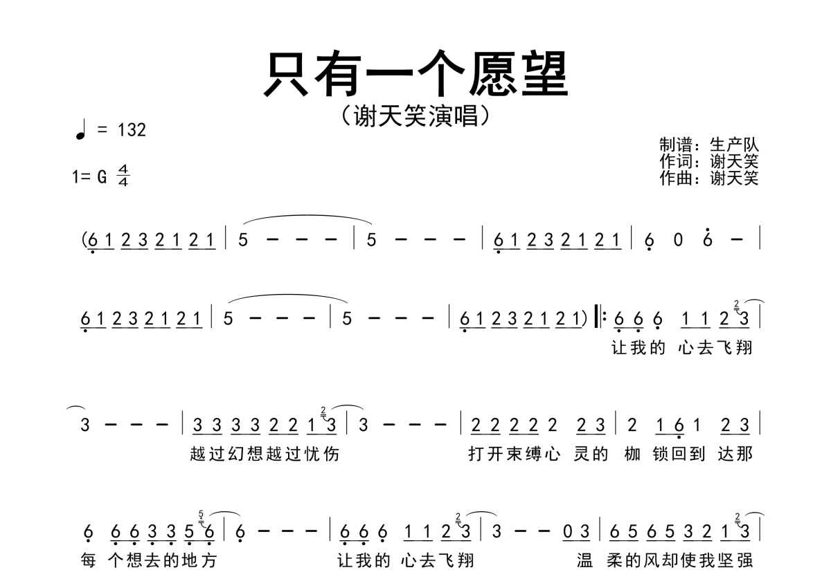 谢天笑《只有一个愿望》简谱 - 原版简谱