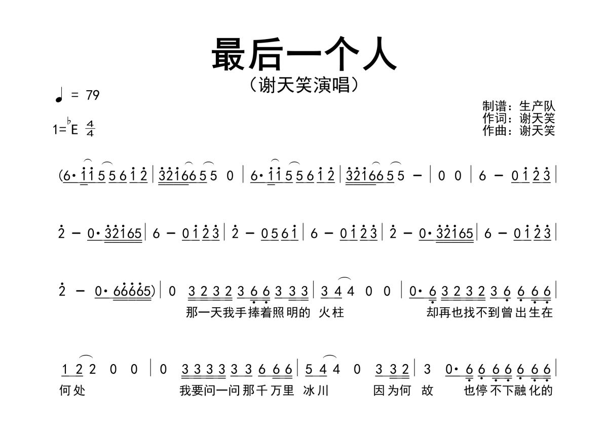 《最后一个人》是谢天笑演唱的一首歌曲,原版简谱,拍号为4/4拍,歌曲速度为每分钟79拍,这份简谱共有两张高清图谱,图谱由 @生产队 编配上传谢天笑演唱的歌曲《最后一个人》原版简谱。