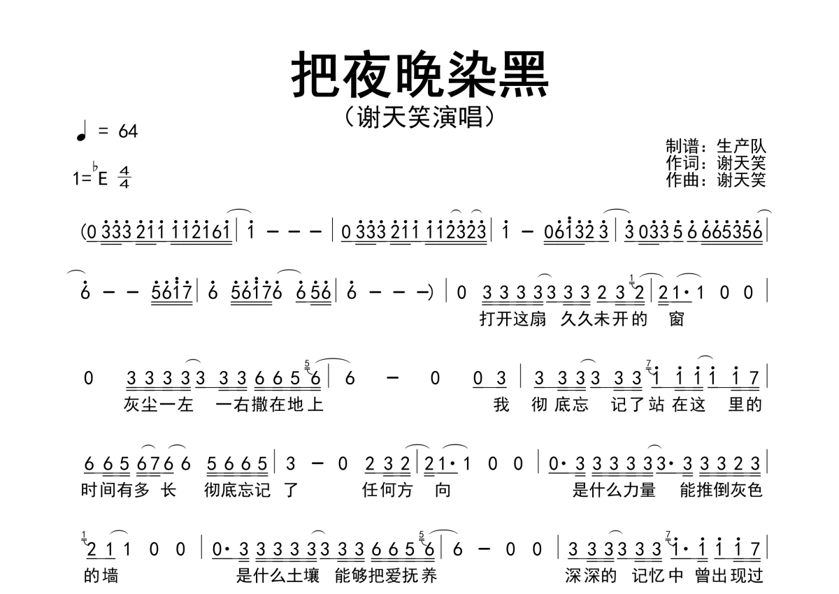 《把夜晚染黑》是谢天笑演唱的一首歌曲,原版简谱,拍号为4/4拍,歌曲速度为每分钟64拍,这份简谱共有一张高清图谱,图谱由 @生产队 编配上传谢天笑演唱的歌曲《把夜晚染黑》原版简谱。