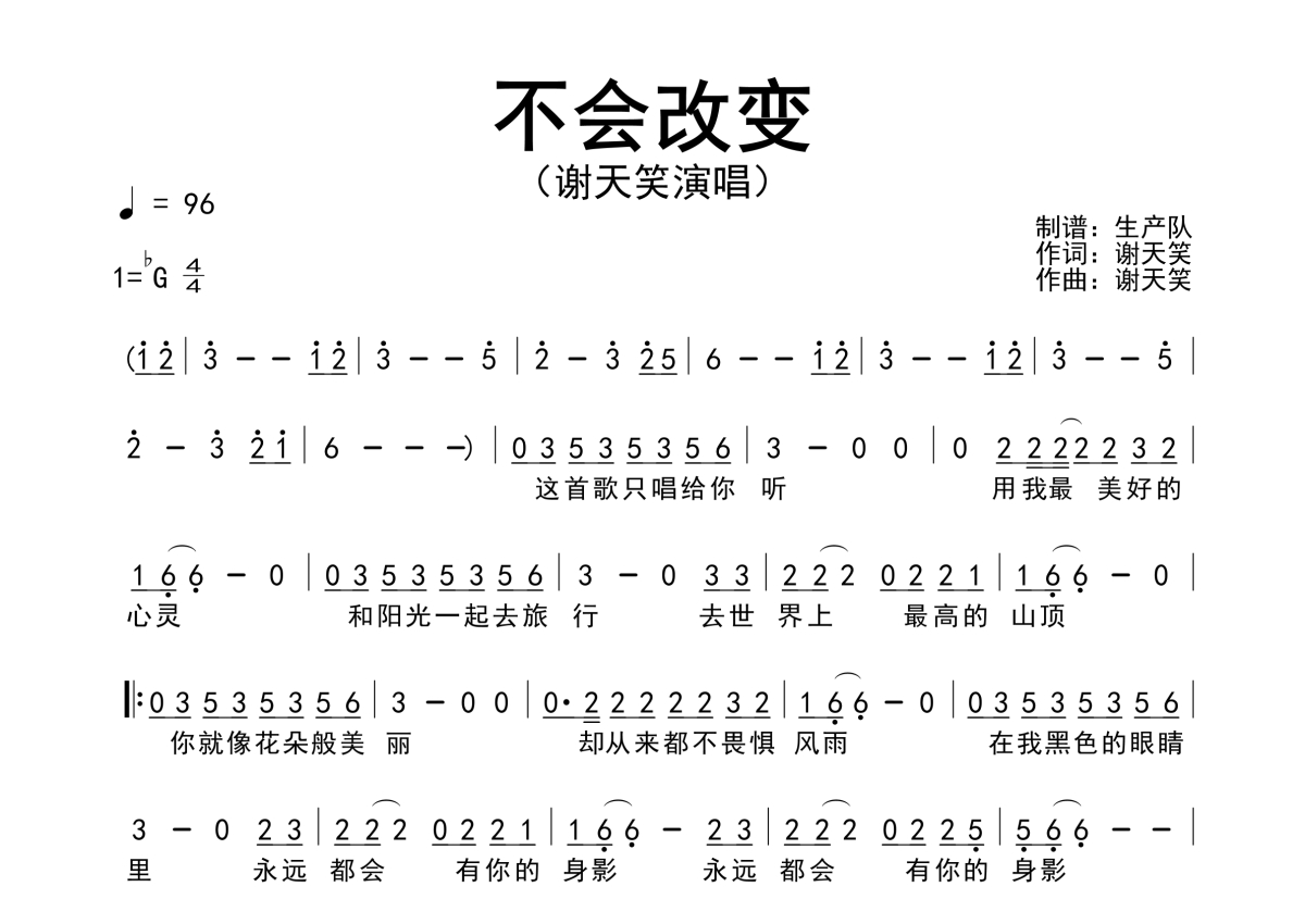 《不会改变》是谢天笑演唱的一首歌曲,原版简谱,拍号为4/4拍,歌曲速度为每分钟96拍,这份简谱共有一张高清图谱,图谱由 @生产队 编配上传谢天笑演唱的歌曲《不会改变》原版简谱。