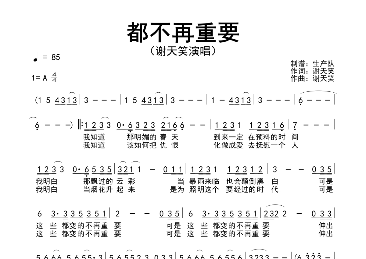 《都不再重要》是谢天笑演唱的一首歌曲,原版简谱,拍号为4/4拍,歌曲速度为每分钟85拍,这份简谱共有一张高清图谱,图谱由 @生产队 编配上传谢天笑演唱的歌曲《都不再重要》原版简谱。