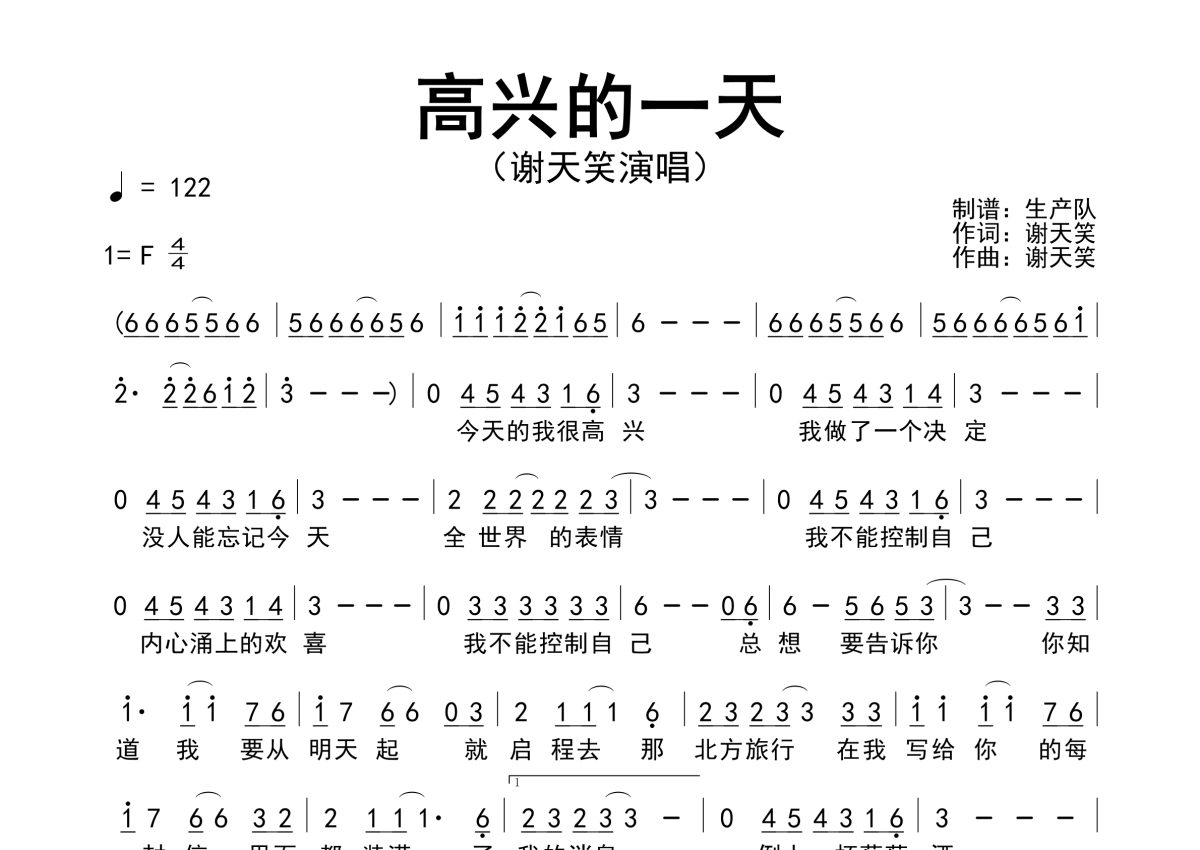 《高兴的一天》是谢天笑演唱的一首歌曲,原版简谱,拍号为4/4拍,歌曲速度为每分钟122拍,这份简谱共有一张高清图谱,图谱由 @生产队 编配上传谢天笑演唱的歌曲《高兴的一天》原版简谱。
