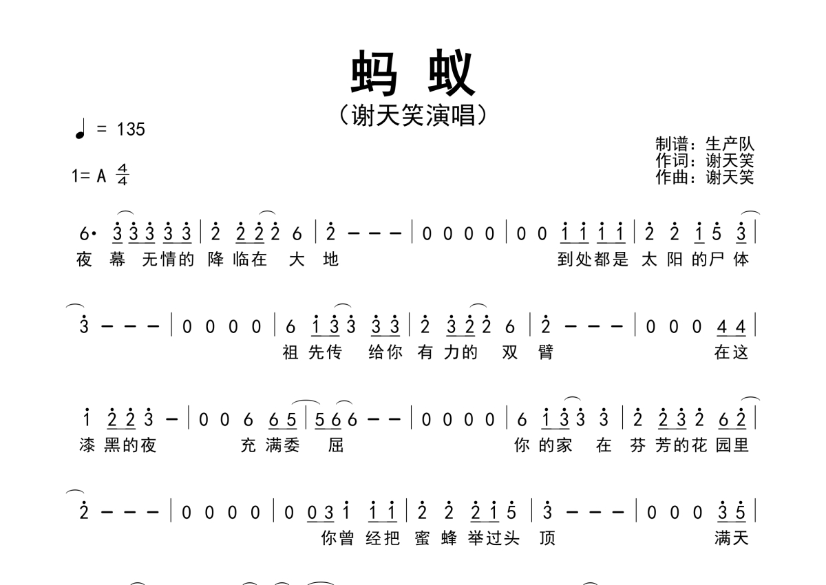 《蚂蚁》是谢天笑演唱的一首歌曲,原版简谱,拍号为4/4拍,歌曲速度为每分钟135拍,这份简谱共有一张高清图谱,图谱由 @生产队 编配上传谢天笑演唱的歌曲《蚂蚁》原版简谱。
