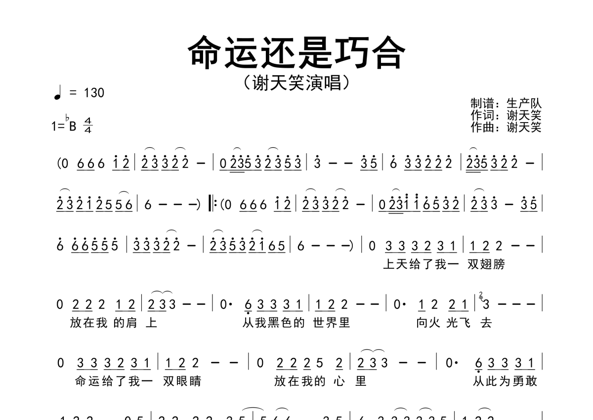 《命运还是巧合》是谢天笑演唱的一首歌曲,原版简谱,拍号为4/4拍,歌曲速度为每分钟130拍,这份简谱共有一张高清图谱,图谱由 @生产队 编配上传谢天笑演唱的歌曲《命运还是巧合》原版简谱。