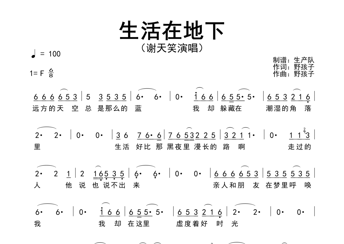 《生活在地下》是谢天笑演唱的一首歌曲,原版简谱,拍号为6/8拍,歌曲速度为每分钟100拍,这份简谱共有一张高清图谱,图谱由 @生产队 编配上传谢天笑演唱的歌曲《生活在地下》原版简谱。