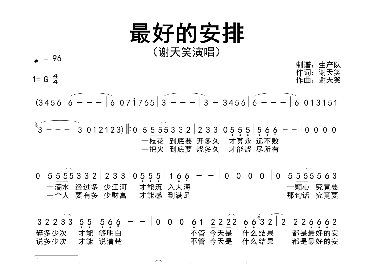 《最好的安排》是谢天笑演唱的一首歌曲,原版简谱,拍号为4/4拍,歌曲速度为每分钟96拍,这份简谱共有一张高清图谱,图谱由 @生产队 编配上传谢天笑演唱的歌曲《最好的安排》原版简谱。