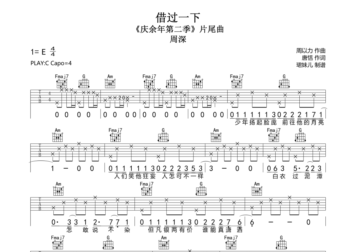 周深《借过一下》吉他谱 - C调弹唱六线谱