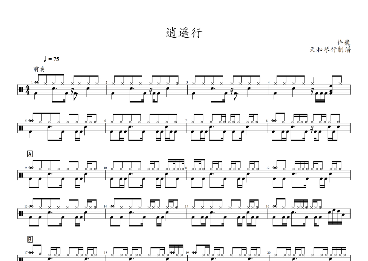 《逍遥行》是许巍演唱的一首歌曲,拍号为4/4拍,歌曲速度为每分钟75拍,这份架子鼓谱共有两张高清图谱,图谱由 @音符喷血者 编配上传,图谱使用五线谱编配,使用这份逍遥行架子鼓谱,你将能够轻松地敲打出这首许巍的逍遥行,快来尝试吧。
