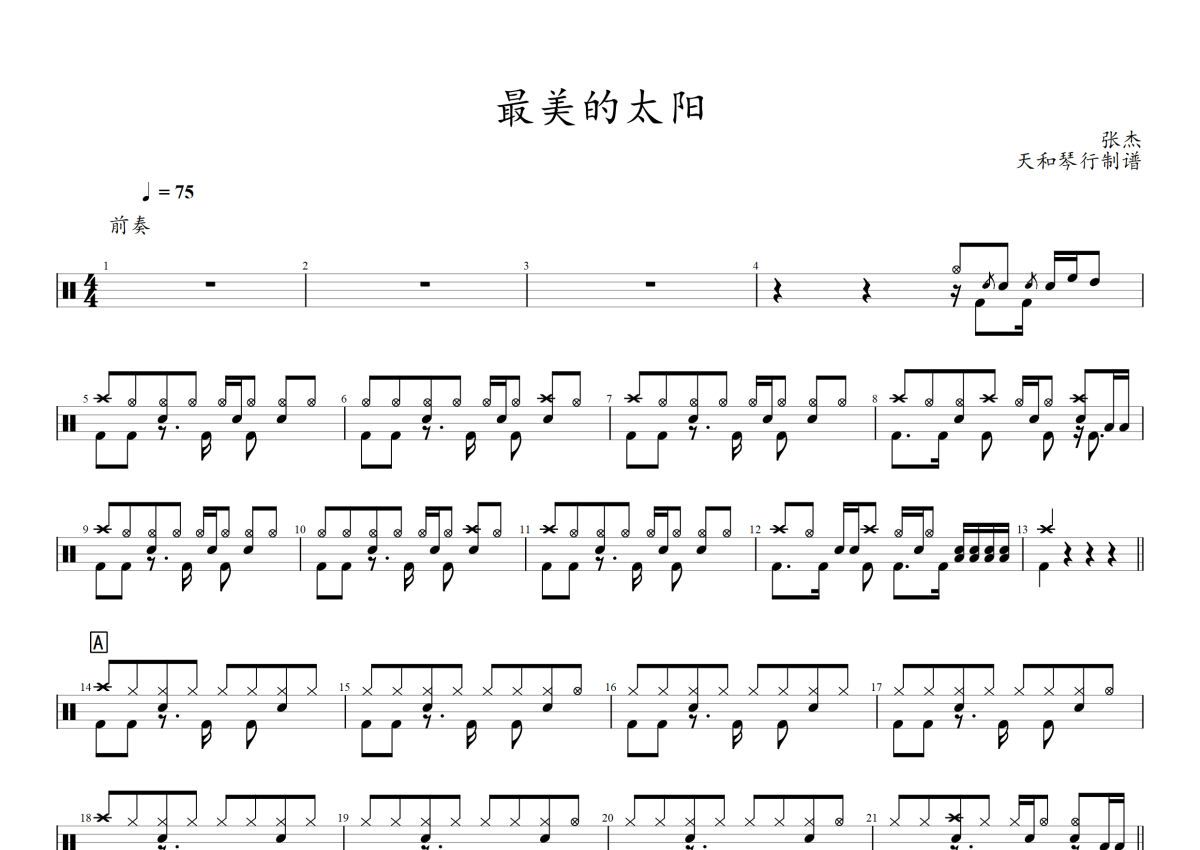 《最美的太阳》是张杰演唱的一首歌曲,拍号为4/4拍,歌曲速度为每分钟75拍,这份架子鼓谱共有两张高清图谱,图谱由 @音符喷血者 编配上传,图谱使用五线谱编配,使用这份最美的太阳架子鼓谱,你将能够轻松地敲打出这首张杰的最美的太阳,快来尝试吧。