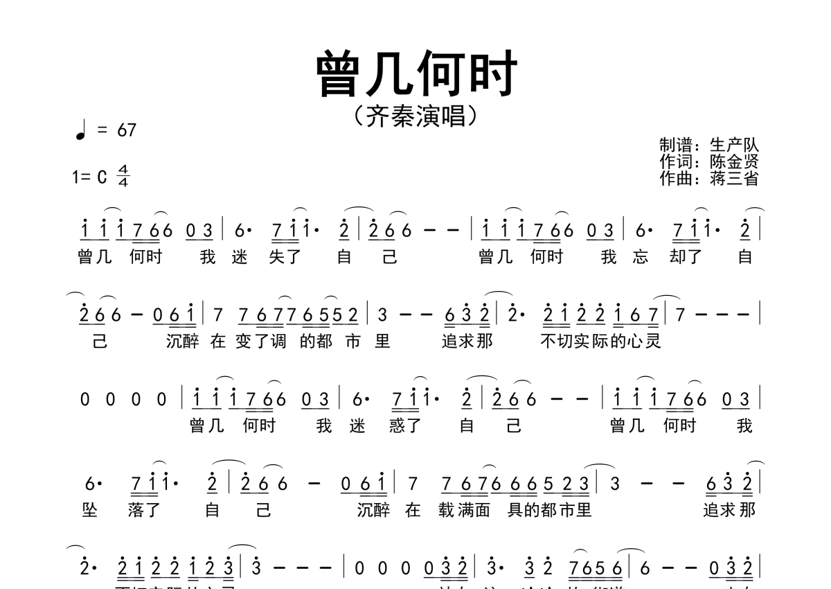 《曾几何时》是齐秦演唱的一首歌曲,原版简谱,拍号为4/4拍,歌曲速度为每分钟67拍,这份简谱共有一张高清图谱,图谱由 @生产队 编配上传齐秦演唱的经典歌曲《曾几何时》原版简谱。