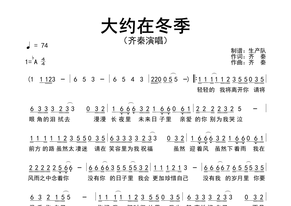 《大约在冬季》是齐秦演唱的一首歌曲,原版简谱,拍号为4/4拍,歌曲速度为每分钟74拍,这份简谱共有一张高清图谱,图谱由 @生产队 编配上传齐秦演唱的经典歌曲《大约在冬季》原版简谱。