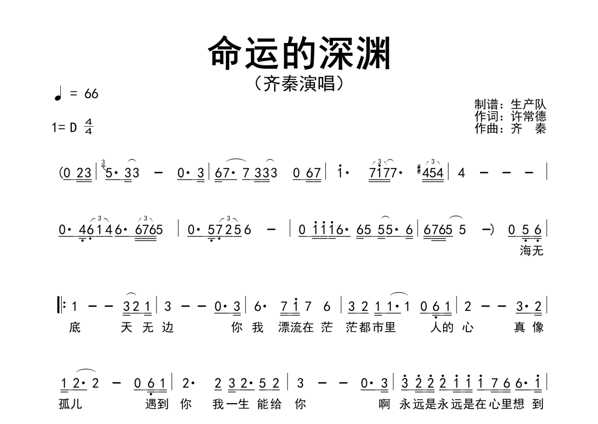 《命运的深渊》是齐秦演唱的一首歌曲,原版简谱,拍号为4/4拍,歌曲速度为每分钟66拍,这份简谱共有一张高清图谱,图谱由 @生产队 编配上传齐秦演唱的经典歌曲《命运的深渊》原版简谱。
