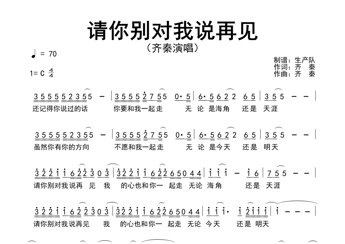 《请你别对我说再见》是齐秦演唱的一首歌曲,原版简谱,拍号为4/4拍,歌曲速度为每分钟70拍,这份简谱共有一张高清图谱,图谱由 @生产队 编配上传齐秦演唱的经典歌曲《请你别对我说再见》原版简谱。