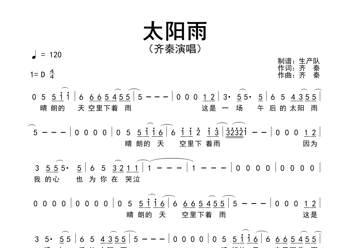 《太阳雨》是齐秦演唱的一首歌曲,原版简谱,拍号为4/4拍,歌曲速度为每分钟120拍,这份简谱共有一张高清图谱,图谱由 @生产队 编配上传齐秦演唱的经典歌曲《太阳雨》原版简谱。
